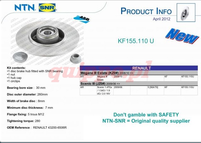 Tarcza hamulcowa tylna Renault Laguna III coupe z łożyskiem Średnica [mm]: 260 Grubość tarczy [mm]: 8 Typ tarczy: pełna Ilość otworów: 5 Informacja uzupełniająca 2: z łożyskiem koła Informacja uzupełniająca 2: ze zintegrowanym magnetycznym pierścieniem czujnikaStosowana w : RENAULT GRAND SCÉNIC III (JZ0/1_) 1.5 dCi (2009.04 - ???); 1461.00 ccm - 110.00 KM/81.00 kW; Silnik: K9K 836 1.5 dCi (2009.04 - ???); 1461.00 ccm - 86.00 KM/63.00 kW; Silnik: K9K 830 1.5 dCi (2010.11 - ???); 1461.00 ccm - 95.00 KM/70.00 kW; Silnik: K9K 846 1.6 dCi (JZ00, JZ12) (2011.04 - ???); 1598.00 ccm - 130.00 KM/96.00 kW; Silnik: R9M 402; R9M 404 1.6 16V Bifuel (2009.02 - ???); 1598.00 ccm - 110.00 KM/81.00 kW; Silnik: K4M 866 1.4 16V (2009.02 - ???); 1397.00 ccm - 131.00 KM/96.00 kW; Silnik: H4J 700 1.6 16V (2009.02 - ???); 1598.00 ccm - 109.00 KM/81.00 kW; Silnik: K4M 9 766 2.0 16V (2009.02 - ???); 1997.00 ccm - 140.00 KM/103.00 kW; Silnik: M4R F 713 1.5 dCi (2009.02 - ???); 1461.00 ccm - 106.00 KM/78.00 kW; Silnik: K9K 832 1.9 dCi (2009.02 - ???); 1870.00 ccm - 131.00 KM/96.00 kW; Silnik: F9Q 870 RENAULT MEGANE CC (EZ0/1_) 1.6 16V (2010.06 - ???); 1598.00 ccm - 110.00 KM/81.00 kW; Silnik: K4M 858; K4M 866 2.0 CVT (2010.06 - ???); 1997.00 ccm - 140.00 KM/103.00 kW; Silnik: M4R F 711; M4R F 713 2.0 TCe (EZ1T) (2010.06 - ???); 1998.00 ccm - 180.00 KM/132.00 kW; Silnik: F4R 870; F4R 872 1.4 TCe (EZ0F, EZ1V) (2010.06 - ???); 1397.00 ccm - 131.00 KM/96.00 kW; Silnik: H4J 700 1.5 dCi (EZ09, EZ0D, EZ1G) (2010.06 - ???); 1461.00 ccm - 110.00 KM/81.00 kW; Silnik: K9K 836; K9K 837 1.9 dCi (EZ0J, EZ1S) (2010.06 - ???); 1870.00 ccm - 131.00 KM/96.00 kW; Silnik: F9Q 870 2.0 dCi (EZ0L) (2010.06 - ???); 1995.00 ccm - 160.00 KM/118.00 kW; Silnik: M9R 610 RENAULT MEGANE III Grandtour (KZ0/1) 1.5 dCi (KZ1M, KZ1W) (2009.02 - ???); 1461.00 ccm - 106.00 KM/78.00 kW; Silnik: K9K 836; K9K 846 1.6 16V (KZ0H) (2009.05 - ???); 1598.00 ccm - 101.00 KM/74.00 kW; Silnik: K4M P 848 1.6 16V (KZ0U, KZ1B, KZ1U) (2009.05 - ???); 1598.00 ccm - 110.00 KM/81.00 kW; Silnik: K4M 858 2.0 CVT (KZ0G, KZ1P) (2009.05 - ???); 1997.00 ccm - 140.00 KM/103.00 kW; Silnik: M4R F 713; M4R 711 1.4 TCe (KZ0F, KZ1F) (2009.05 - ???); 1397.00 ccm - 130.00 KM/96.00 kW; Silnik: H4J 700 1.5 dCi (KZ0C, KZ1A) (2009.05 - ???); 1461.00 ccm - 90.00 KM/66.00 kW; Silnik: K9K 834 1.5 dCi (KZ0D, KZ09, KZ1G) (2009.02 - ???); 1461.00 ccm - 110.00 KM/81.00 kW; Silnik: K9K 836; K9K 837; K9K 846 1.9 dCi (KZ0N, KZ0J, KZ1S) (2009.05 - ???); 1870.00 ccm - 131.00 KM/96.00 kW; Silnik: F9Q 870; F9Q 872 2.0 dCi (KZ0L) (2009.04 - ???); 1995.00 ccm - 160.00 KM/118.00 kW; Silnik: M9R 610 2.0 TCe (KZ0K, KZ1T) (2008.11 - ???); 1998.00 ccm - 180.00 KM/132.00 kW; Silnik: F4R 870; F4R 872 1.6 16V Bifuel (KZ03) (2008.11 - ???); 1598.00 ccm - 110.00 KM/81.00 kW; Silnik: K4M 866 RENAULT SCÉNIC III (JZ0/1_) 1.5 dCi (2009.04 - ???); 1461.00 ccm - 110.00 KM/81.00 kW; Silnik: K9K 836 1.5 dCi (2009.04 - ???); 1461.00 ccm - 86.00 KM/63.00 kW; Silnik: K9K 830 1.5 dCi (2010.11 - ???); 1461.00 ccm - 95.00 KM/70.00 kW; Silnik: K9K 846 1.6 E85 (2009.02 - ???); 1598.00 ccm - 110.00 KM/81.00 kW; Silnik: K4M 866 1.6 dCi (JZ00, JZ12) (2011.04 - ???); 1598.00 ccm - 130.00 KM/96.00 kW; Silnik: R9M 402; R9M 404 1.6 16V (2009.02 - ???); 1598.00 ccm - 110.00 KM/81.00 kW; Silnik: K4M 9 766 1.4 16V (2009.02 - ???); 1397.00 ccm - 131.00 KM/96.00 kW; Silnik: H4J 700 2.0 16V (2009.02 - ???); 1997.00 ccm - 140.00 KM/103.00 kW; Silnik: M4R F 713 1.5 dCi (2009.02 - ???); 1461.00 ccm - 106.00 KM/78.00 kW; Silnik: K9K 832 1.9 dCi (2009.02 - ???); 1870.00 ccm - 131.00 KM/96.00 kW; Silnik: F9Q 870